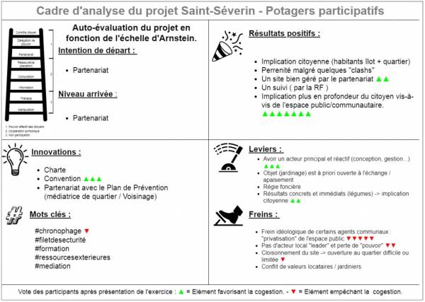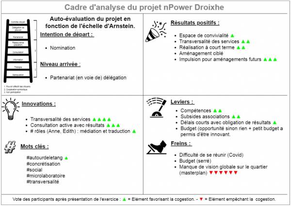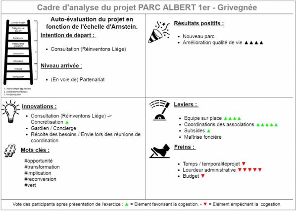Après une rapide présentation des niveaux de participation et de l’échelle d’Arnstein, ils ont analysés, en sous- groupes et grâce à un cadre d’analyse, deux projets particuliers mettant en œuvre de la participation citoyenne sur le territoire de Liège: