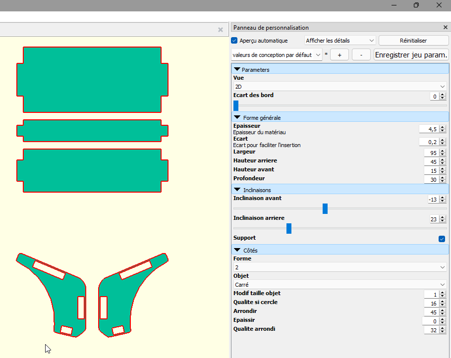 Une fois le modèle voulu acceptable, il est possible d'en créer un modèle 2D exportable en DXF ou en SVG :